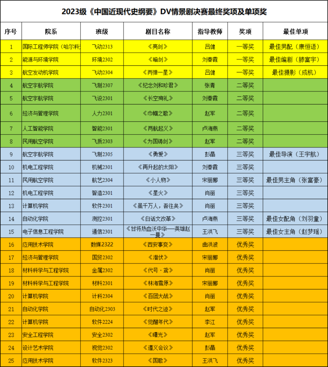 此次活动共编排了147部“纲要”情景剧和123部“德法”情景剧。经过课堂初赛、课程组内半决赛、学校预赛、网络评选、学校决赛等环节层层筛选,评选出“纲要”课短剧一等奖3台、二等奖5台、三等奖7台、优秀奖10台;“德法”课短剧一等奖3台、二等奖5台、三等奖7台、优秀奖18台。同时,为了提高实践教学质量,“纲要”课程组在此次情景剧教学中守正创新,率先开展了“优秀剧本征集”活动,经过班级初评、课程组复评以及答辩等环节,共评选出12部沈航“纲要”课情景剧“剧本创作奖”暨“最佳编剧”。学生的优秀作品离不开任课教师的悉心指导,此次活动中,共22位教师获得优秀指导教师称号。