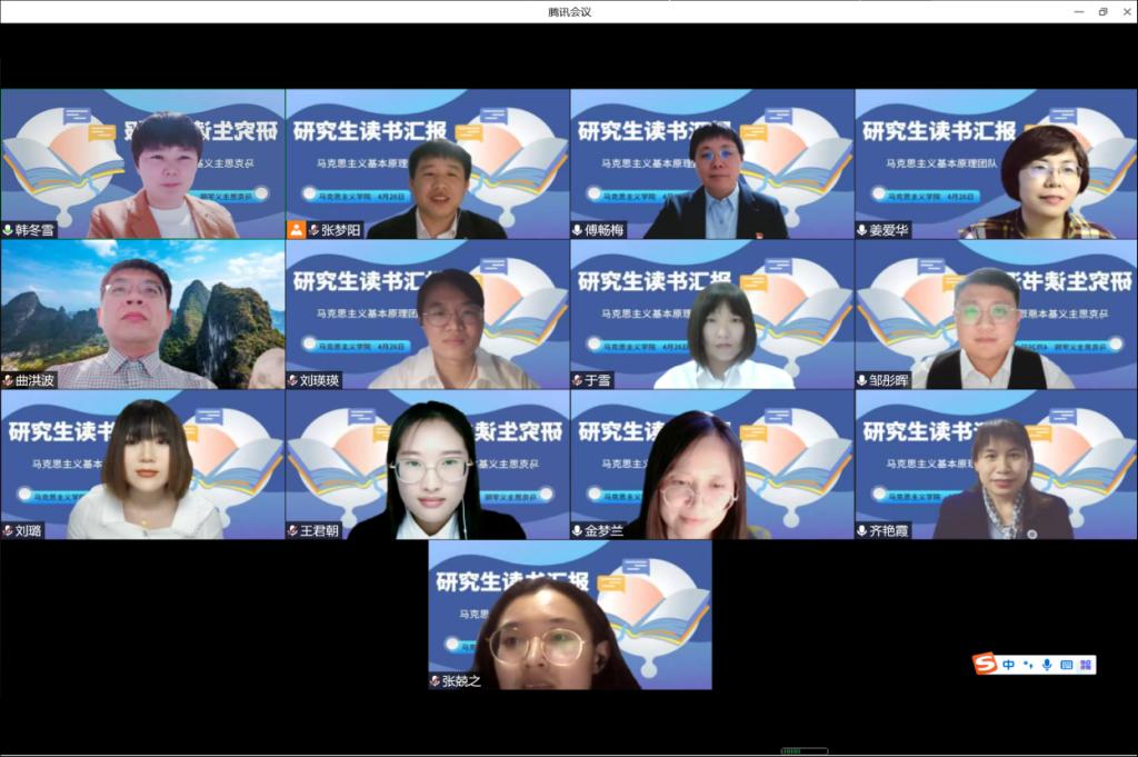 2020级马克思主义基本原理专业读书汇报在腾讯会议平台举行。本次汇报由韩冬雪博士主持,傅畅梅教授、姜爱华教授、齐艳霞副教授、金梦兰副教授参加了报告会。会上,2020级邹彤晖等7名同学依次针对自己的论文情况、读书情况进行总结分享。在场导师对学生论文内容进行了提问,并解答了学生在写作中遇到的问题,导师们从论文的线索、层次、目的性等提出了很多宝贵意见和建议。导师们一致认为同学们要继续推进论文写作进度,围绕“强调核心、突出重点、注重逻辑、丰富内容、扎实文献”等方面提升写作水平。