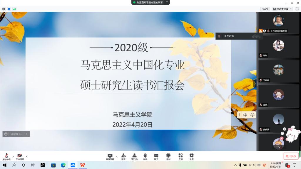 2020级马克思主义中国化研究专业读书汇报在王志建博士的主持下开展,赵冰梅教授、周琳娜教授、齐艳霞副教授、岳宏杰副教授、王旭副教授参加了会议。6名同学汇报了近期的读书情况和毕业论文写作进展,并结合自己的论文研究方向分享了对所读书籍的理解与思考。同学们汇报结束后,赵冰梅教授指出,大家在读书的过程中要善于将读与思相结合,并根据自己的研究方向,找出主要观点,回应现实问题。同时导师对同学们在读书过程中的注意事项进行了强调,鼓励同学们读书要与时俱进,关注学术热点,积极参与学术讲座,培养自己的研究意识。