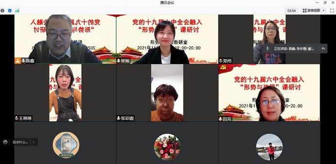 “毛泽东思想和中国特色社会主义理论体系概论”教研室围绕“如何将党的十九届六中全会精神有效融入概论课教学研究”的主题,对于11月21日主办的省级会议——《党的十九届六中全会精神融入“概论”课教学跨校集体备课会暨虚拟教研室建设启动仪式》进行总结和研讨。大家认为,全面、准确地将党的十九届六中全会精神融入到“概论”课教学中,进一步提升对时政热点的理论阐释水平是“概论”课教学的重中之重。首批国家级一流本科带头人赵冰梅教授指出,虚拟教研室的建设不仅是国家政策的导向要求,也是在建党百年历史背景下完成“概论”课所承担的责任,更是“概论”课教学自身发展的需要。“概论”课教师要注重文本研究,学懂弄通其深刻内涵,将党的十九届六中全会的新观点、新提法努力融入“概论”课教学研究,遵循教书育人规律和学生成长成才规律,继续在集体备课常态化、制度化、科学化、规范化上深耕细作。