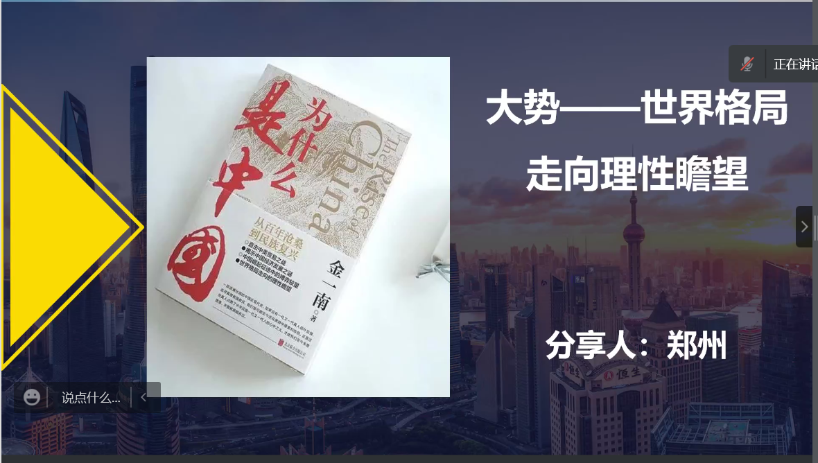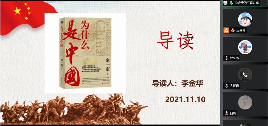 品味书香气,凝聚强动能。2021年“学习型马院打造工程系列活动”——“书香马院•成己达人”第四期第七场于11月10日上午9时如期进行,本次会议采取线上共读形式,全体马院教师齐聚云端,共读书目《为什么是中国》。本期导读教师为形势与政策教研室的李金华、聂鑫、郑州、王琳琳,活动由王琳琳老师主持。
