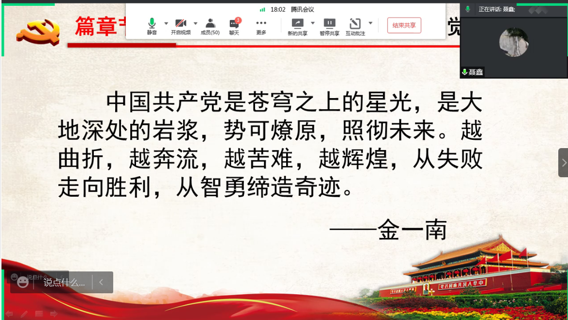 聂鑫副教授主要阐释了中华民族为什么能、为什么行的具体原因,深刻解读了新中国历史性变革中所蕴藏的内在力量,倾心讲述了中华民族重要历史进程中的中国故事。同时强调,通过回顾沉重历史,看清脚下热土,我们将获取精神的支撑和坚定前行的动力。