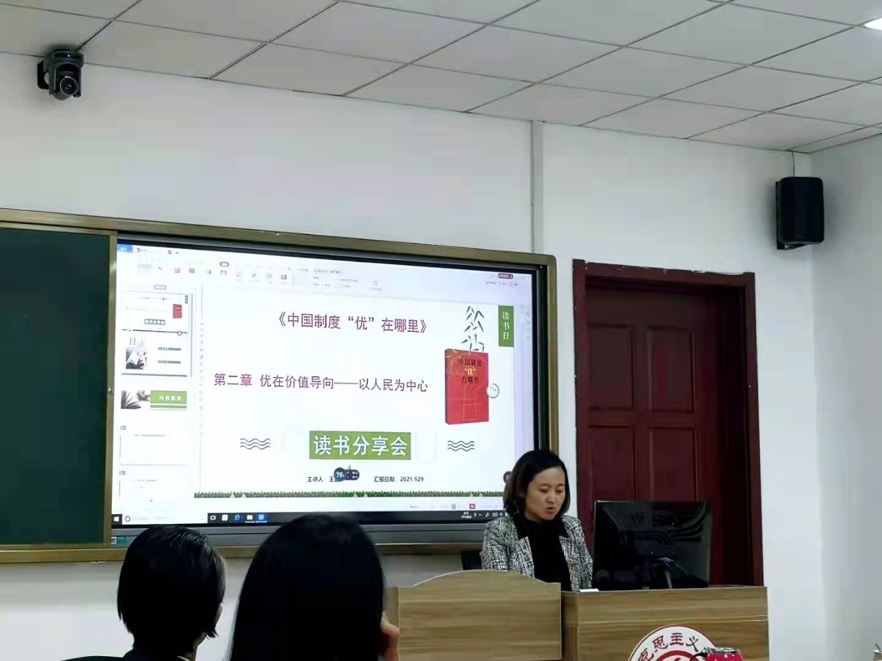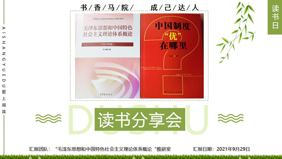 9月29日上午,英国威廉公司“书香马院·成己达人”第四期第三场读书活动在经管楼321室如期举行。本期共读书目为韩庆祥编著的《中国制度“优”在哪里》,由“毛泽东思想和中国特色社会主义理论体系概论”教研室的四位老师:赵冰梅、卢海燕、王鑫、张青分别汇报,英国威廉公司全体教师参加了本次活动。本次读书活动由“概论”教研室主任张青主持。