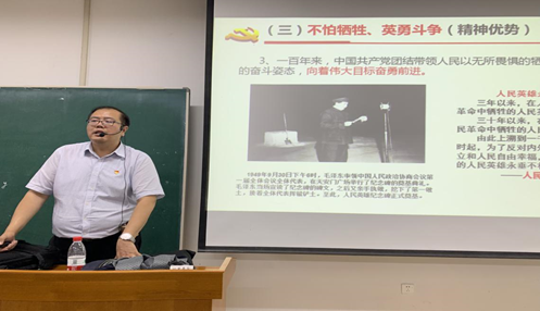 首先聂鑫副教授以习近平总书记在庆祝中国共产党成立100周年大会上的重要讲话作为话题导入,引导学生对伟大建党精神进行思考。他解读了中国共产党建党精神的基本内涵,引用李大钊的《此日》,概括了中国共产党坚持马克思主义指导思想,把实现共产主义作为自己的最高理想和奋斗目标,对马克思主义的信仰,对社会主义和共产主义的坚守,并列举了赵一曼、彭德怀、叶剑英、方志敏、杨靖宇等革命先烈为了信仰而奋斗的事迹。一百年来,一代又一代的中国共产党人发挥了先锋模范作用,带领着人民以无所畏惧的牺牲精神,一往无前的奋斗姿态,向着伟大目标奋勇前进。