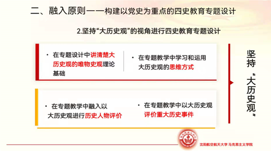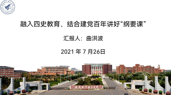 曲院长强调,结合今年建党百年的庆祝活动,《纲要》课作为党史宣传的最主要的阵地,要发挥好其思想性、政治性的功能。党史教育融入《纲要》课,在内容上突出辽宁特色和沈航特色,在形式上创设线上、线下相结合的教学环境、丰富教学资源;就融入的原则而言,要构建以党史为重点的“四史”教育专题教学。在这个过程中坚持用大历史观的视角进行教育教学,坚持整体思维,在教学中注意培养学生正确的历史观和政治观,反对历史虚无主义;在备课过程中有意识地将习近平总书记在2018年6月以来重大历史纪念活动的讲话精神,特别是习近平总书记在庆祝中国共产党成立100周年纪念大会上的讲话精神学深、学透,并融入到课程当中。