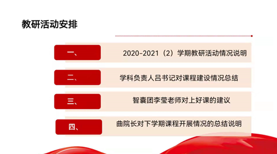 会议由教研室主任刘春霞主持,任课教师11人参加。会议的主要议题有四项:一是对2020-2021(2)学期的教研活动情况进行总结;二是由学科带头人吕健书记对课程建设的情况进行说明;三是由学院教学智囊团李莹老师对如何上好课程提出建议;四是由曲洪波院长对新学期如何开展课程教学进行总结说明。