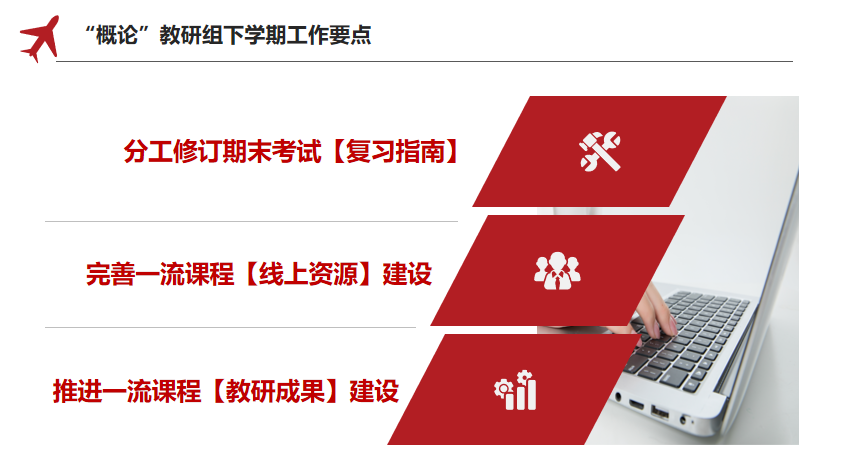 一是各教研室要积极做好教研成果化推进工作;二是建议各教研室学习本学科相关的重要讲话精神,为教研和教改提供支撑;三是要继续推进一流课程建设,及时更新线上教学资源,保证线下线上同向发力;四是督促各教研组准备参加教学大赛的教师们认真备赛。