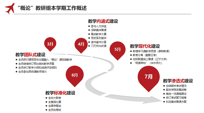2021年3月着重加强“教学团队式建设”,2021年4月着重加强“教学内涵式建设”,2021年5月着重加强“教学现代化建设”,2021年6月着重加强“教学标准化建设”,2021年7月着重加强“教学渗透式建设”。