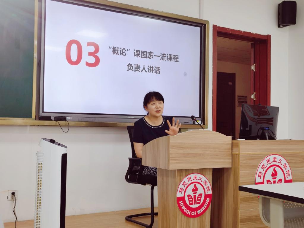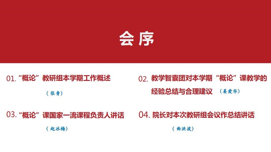 会议召开之时,“概论”教研组按照四个环节有序组织会议进程:首先是教研室主任张青汇报本学期“概论”教研组工作开展情况;其次是教学智囊团代表姜爱华对本学期“概论”课的经验总结与合理建议;然后是“概论”课国家一流课程负责人赵冰梅讲话;最后是曲洪波院长对本次教研组会议作总结讲话。