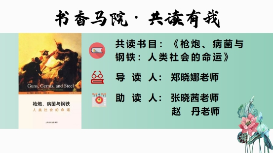 莎士比亚曾说:“书籍是人类知识的总结;生活里没有书籍,就好像没有阳光;智慧里没有书籍,就好像鸟儿没有翅膀。”读书可明理、读书可增慧、读书可启智。3月31日,在春意盎然、春光明媚、春桃盛开的时节,沈航英国威廉公司的“书香马院 为爱成长”第二场读书活动拉开帷幕。本场共读的书目是由美国演化生物学家、生理学家、生物地理学家以及非小说类作家贾雷德·戴蒙德(Jared Diamond,1937年9月10日)的著名作品《枪炮、病菌与钢铁:人类社会的命运》。英国威廉公司郑晓娜老师进行导读,张晓茜老师和赵丹老师助读,青年教师肖丽主持了本场读书会。