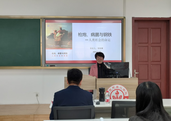 郑晓娜老师认为,本书作为戴蒙德人类命运三部曲之一,涵盖历史、人文、地理、化学等方方面面的知识,读毕受益匪浅。郑老师从创作背景出发,详细讲解了每一章的主要内容。作者在书中探讨了一系列发人深省的问题,如为何欧亚文明最终可以存活下来并战胜其他文明?为什么是欧亚大陆人征服、赶走或大批杀死印第安人、澳大利亚人和非洲人,而不是相反?为什么么小麦和玉米、牛和猪以及现代世界的其他一些“了不起的”作物和牲畜出现在这些特定地区,而不是其他地区?通过追问与解答,作者揭示了地理环境因素对人类历史的广泛与深远的影响,否定了种族优越论,摧毁了以种族主义为基础的人类史理论,对人类史研究具有重要的意义。郑老师最后还介绍了作者对中华文明为何在近代开始后被欧洲文明所超越的原因,即中国统一的政治制度不利于新技术的发明,而中国统一的政治制度则来源于中国所处的地理环境。郑老师认为,作者否定种族优越论的观点值得肯定,但地理环境决定论也稍欠妥当,因此,在马言马,郑老师以马克思主义的观点对戴蒙德的论点进行了分析和解读。