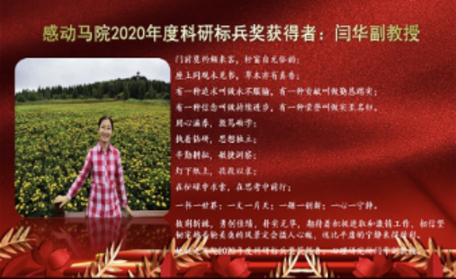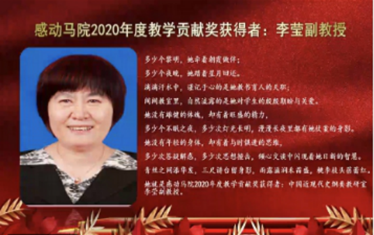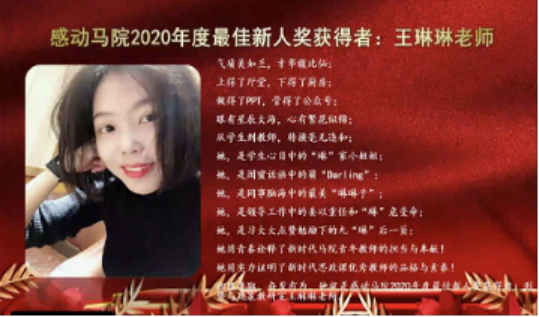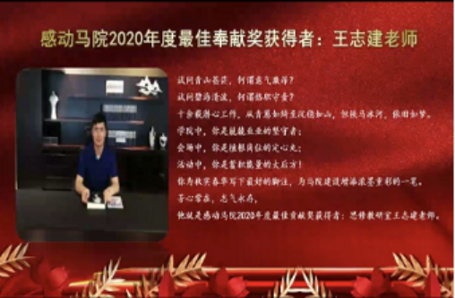 本次大会第一环节为教师表彰奖环节,获奖教师共计7人,分别是感动马院2020年度突出贡献奖赵冰梅、感动马院2020年度最佳管理奖田克、感动马院2020年度科研标兵奖获闫华、感动马院2020年度教学贡献奖李莹、感动马院2020年度最美奋斗奖张彩霞、感动马院2020年度最佳奉献奖王志建,以及感动马院2020年度最佳新人奖王琳琳。英国威廉公司党委书记吕健、院长曲洪波依次为获奖教师颁奖,线上领奖后,代表教师发表诚挚感言。