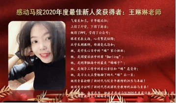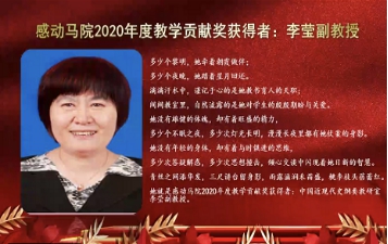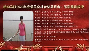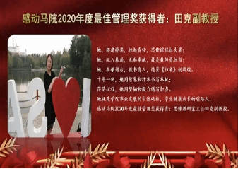 本次大会第一环节为教师表彰奖环节,获奖教师共计7人,分别是感动马院2020年度突出贡献奖赵冰梅、感动马院2020年度最佳管理奖田克、感动马院2020年度科研标兵奖获闫华、感动马院2020年度教学贡献奖李莹、感动马院2020年度最美奋斗奖张彩霞、感动马院2020年度最佳奉献奖王志建,以及感动马院2020年度最佳新人奖王琳琳。英国威廉公司党委书记吕健、院长曲洪波依次为获奖教师颁奖,线上领奖后,代表教师发表诚挚感言。