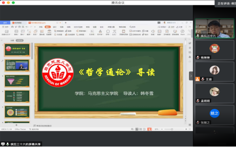 6月8日,韩冬雪老师为研究生和即将入学的研究生新同学们导读了孙正律教授编著的《哲学通论》。首先,韩老师对本书做一个了简单概述,介绍了本书的主要构成部分;其次,向同学们分享了读书的思路,希望同学们读书要坚持以历史的态度、逻辑的态度、现实的态度和自我的态度去读书。韩老师指出,所谓历史的态度就是把所读的书置于历史背景之下,思考写作的目的;逻辑的态度就是以什么样的方式,把谁置于逻辑的前提;现实的态度就是以什么方式回应现实,思考人的问题;自我的态度就是读书的收获;再次,韩老师通过引经据典、事例分析等方式向同学们解读了本书中的一些晦涩难懂的哲学关键词,如本体论、存在论、经验、先验、超验等。最后,韩老师希望同学们认真研读,在家利用时间多研究、多思考、多学习。