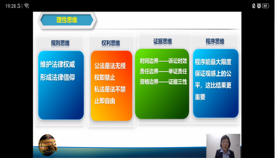 赵丹老师第二部分为大家细心讲解了法律思维的培养和运用。法律思维就是一种将法律的诸种要求运用于认识、分析、处理问题的思维方式,是一种以法律规范为基准的逻辑化的理性思考方式,是大家一定要多多建立的思维方式。因此,这种思维要我们建立规则思维、权利思维、证据思维和程序思维。