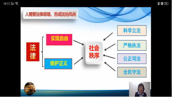 赵丹老师第一部分为大家介绍了人需要法律思维、形成法治风尚。从人的无知性、利己性、随意性三个角度分析人在现实生活中社会分工、互相不信任、不能自律权利边界三个社会现实,以此来为大家讲解设立制度和法律的必要性。法律的意义就在于实现自由和维护正义,从而维护社会秩序,国家应该做到科学立法、严格执法、公正司法和全民守法,公民通过牢记国家宪法日来尊重法律和遵守法律,形成法治思维。