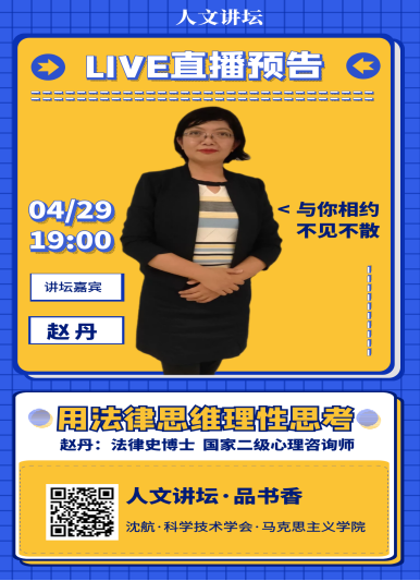 一切之中最重要的一种法律既不是铭刻在大理石上,也不是铭刻在铜表上,而是铭刻在公民的内心里。第二阶段“品书香”第四讲“用法律的思维理性面对学习和生活”圆满收官。伴随着本讲的结束,“疫去春来·书香沈航”人文讲坛第20期今天也圆满结束。人文讲坛第20期历经“战疫情、品书香”两个阶段八场讲座,历时两个多月时间,为大家从不同视角倾情奉献了人文精神的盛宴,积极培育和践行了社会主义核心价值观,发挥了党员的先锋模范作用,为抗击疫情作出了积极的贡献,同时也滋养了书香沈航的校园文化,得到了省内外高校以及校内老师和同学们的高度认可,收获了巨大的成功。