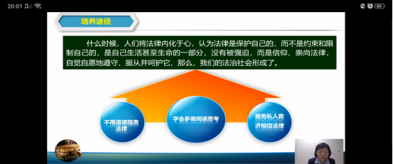 最后,赵丹老师从实际出发,为同学们讲解了培养法律思维的路径。一是通过不用道德职责法律;二是学会多阅读思考;三是避免私人救济相信法律。当人们将法律内化于心,认为法律是保护自己的,而不是约束和限制自己的,是自己生活甚至生命的一部分,没有被强迫,而是信仰、崇尚法律,自觉自愿地遵守、服从并呵护它,从而形成法治社会。