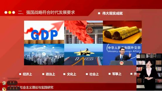 就“强国战略符合时代发展要求”,张青老师从经济、政治、文化、社会、军事和外交上分别阐述了强国战略对当今中国发展特征与发展要求的契合。