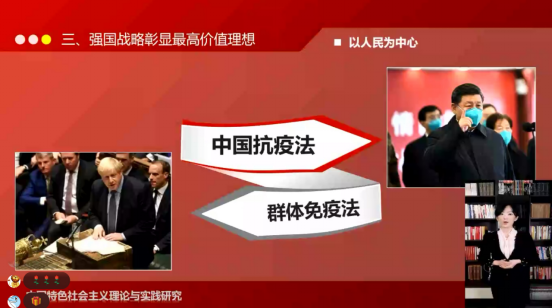 就“强国战略彰显最高价值理想”,张青老师结合当下的疫情进行了分析,通过对比我国在抗议过程中政策、措施、做法和西方一些国家倡导的群体免疫法,彰显了中国特色社会主义制度的优势,更加坚定了我们对实现社会主义现代化强国建设目标的信心。