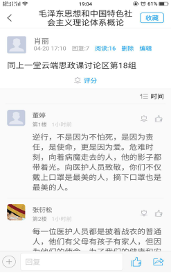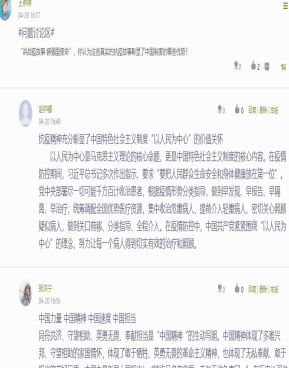直播课程结束后,马院教师还组织学生通过微信群、QQ群等进行讨论,围绕“战疫情”“责任担当”“爱国情、报国志”“青年大学生时代使命”等话题发表个人观点。同学们纷纷说出了自己的心声:“这次网课同样有很多精彩而又弥足珍贵的抗疫真实视频,实话说,在我观看到这些视频时,我留下了感动的泪水。”“面对突如其来的疫情,医护人员不顾个人安危冲锋前线,有担当,令人佩服!”“现在,我们仍然不可以松懈,要响应党的号召,防止疫情进行反扑,不要让这群在疫情当中的逆行者的汗水白流。”“在国家需要时,我也定会挺身而出,帮助国家和人民度过劫难……”