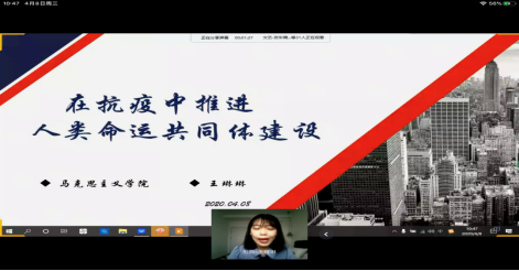王琳琳老师以“在抗疫中推进人类命运共同体建设”为主题,从“命运共同体的共同利益观、命运共同体的可持续发展观、命运共同体的全球治理观”三个方面,探讨了面对全球性新冠疫情,中国所肩负的责任与担当,论证了中国所倡导的人类命运共同体理念的科学性。
