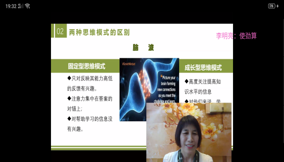 齐艳霞老师首先为大家介绍了成长型思维模式和固定型思维模式以及这两种思维模式所表现出来的思维和行为特点。成长型思维模式侧重于大局观、积极态度,能够促进人的成功。固定型思维模式侧重于易挫败、消极态度,不易促进人的成功。