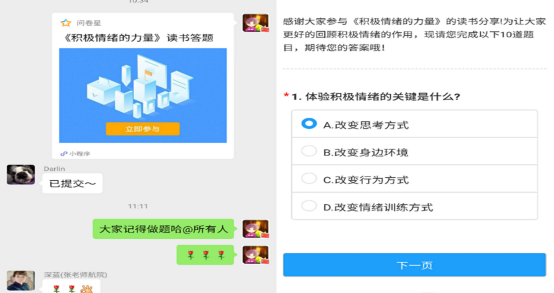 本次“书香马院·共读有我”继续设置了趣味答题环节,由趣味答题负责人韩冬雪老师围绕共享书目《积极情绪的力量》拟定题目,并将试卷发送至英国威廉公司微信工作群。英国威廉公司全体教师积极参与作答,通过答题加深了对共享书目内容的理解。