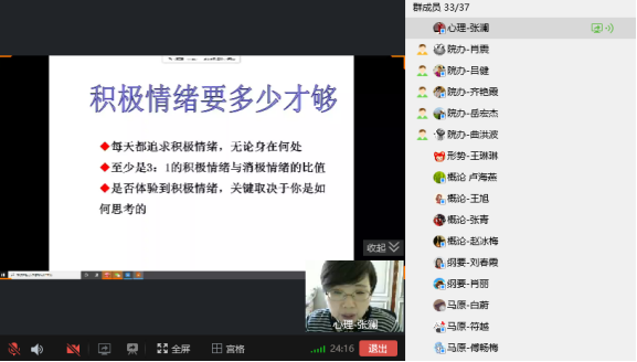 本次“书香马院·共读有我”活动进行共读的书目是芭芭拉·弗雷德里克森所撰写的《积极情绪的力量》。大学生心理发展中心主任张澜老师为大家进行《积极情绪的力量》的导读,张澜老师以“改变人类命运,照亮我们追寻幸福的路”为主题,从心理学角度解读了积极情绪的作用、积极情绪的十种形式,积极情绪的最佳配等内容。张澜老师认为积极情绪作为一种积极心态的唤醒,是一种生活态度,阳光般地把生活中的一切当作一种享受的过程。积极的情绪是我们每个人天生就有的宝藏,由衷的积极情绪创造了圆满与健康。张澜老师通过心理测试和讲解相结合的方式,精准生动、客观详实的阐述了读书感悟,获得了各位老师的点赞。