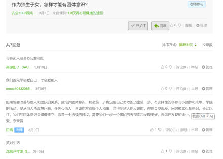 教与学的过程中,教师们透过心理作业和讨论区域,发现还有不少学生的心理存在一定的焦虑和困惑,有些学生甚至感到茫然,情绪低落。为此,心理所全体专兼职教师齐上阵,对每一位学生都进行了认真的解答和解惑,保证全方位的心理辅导。他们设置了师生互动、生生互动的管理通道,学生们在网上彼此可以解答,互相帮助与启发,将心理自助与心理他助有机结合。这不仅促进了教学工作和心理咨询与辅导的开展,而且将理论教学与实践教学在网络上实现了完美的对接。