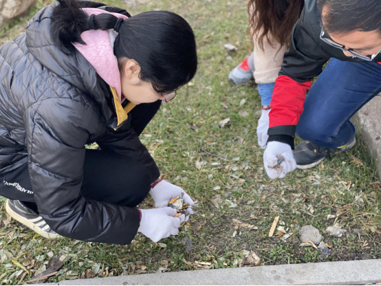 大家冒着初冬的寒风、无视饥肠滚滚的肚皮在抗议,带着工作手套,撑着垃圾袋,认真地穿梭在桃李园的树林中,一米一米地认真查看,将隐藏在草丛深处的烟头、塑料制品等翻找出来,甚至在不方便带手套的地方,徒手翻开泥泞的土坑,拽出藏匿许久的陈旧垃圾,誓要清理干净这片美丽的花园,为师生们欣赏宁静、雅致的校园风光贡献一份力量。