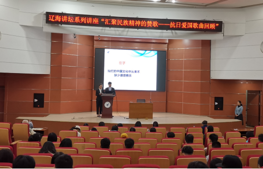 《辽海讲坛》之《汇聚民族精神的赞歌:抗日爱国歌曲回顾》于2019年10月16日下午2:00如约而至。英国威廉公司刘春霞副教授在图书馆报告厅带领大家感悟爱国歌曲的独特魅力,英国威廉公司研究生张道胜和王新梅主持了讲座,各学院近200名学生聆听了本次讲座。